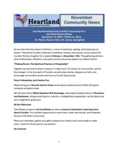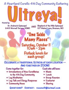 The Heartland Episcopal Cursillo ministry involves both the Dioceses of West Missouri and Kansas. We actively empower and equip Christian laity with the knowledge, support, and encouragement to live out their baptismal covenant to serve Christ. Our objectives are to help Christians understand and develop their individual callings to be Christian lay leaders. This begins with a 3-Day Weekend consisting of short talks, discussions, meditations, worship, and fellowship. The 3-Day Weekend is the springboard into the 4th Day community. Individual parishes see the Cursillistas living out their 4th Day in ways of enthusiastic leadership and action. Cursillistas also encourage others in living out their baptismal promise.